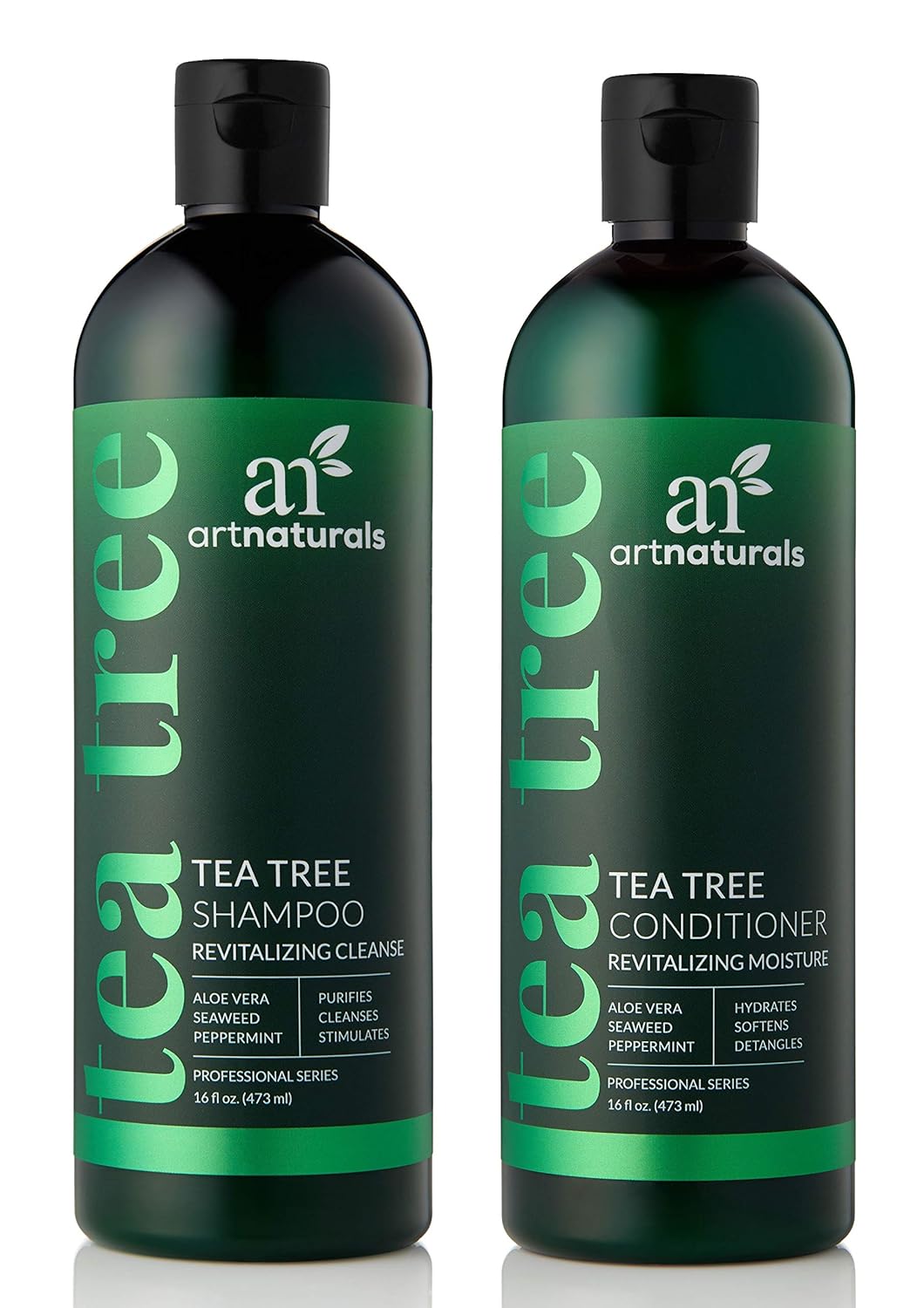 Por ultimo debemos destacar esta marca Art naturals que ofrece este combo de champú + acondicionador por tan solo 28,86 que si nos fijamos bien esta estupendo de precio ya que cada bote contiene 473 ml ademas debemos destacar que esta marca es la mas comprada y comentada por los usuarios con una puntuación total de 4 estrellas.Este champú no solo contiene aceite de arbol de te sino que también contiene otros aceites como el aceite de menta que bloquea la DHT (hormona responsable de la pérdida del cabello) así como proteínas de soja, linolénico, berro quinoa,vitaminas C y E,aloe vera, algas marinas así como otro aceites esenciales que se encargan de acabar con el picor del cuero cabelludo